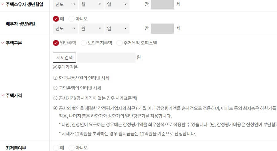 주택소유자의 생년월일과 배우자의 생년월일, 주택구분과 주택가격을 입력해 주세요. 주택가격은 '시세검색'을 이용하여 입력하시면 됩니다.