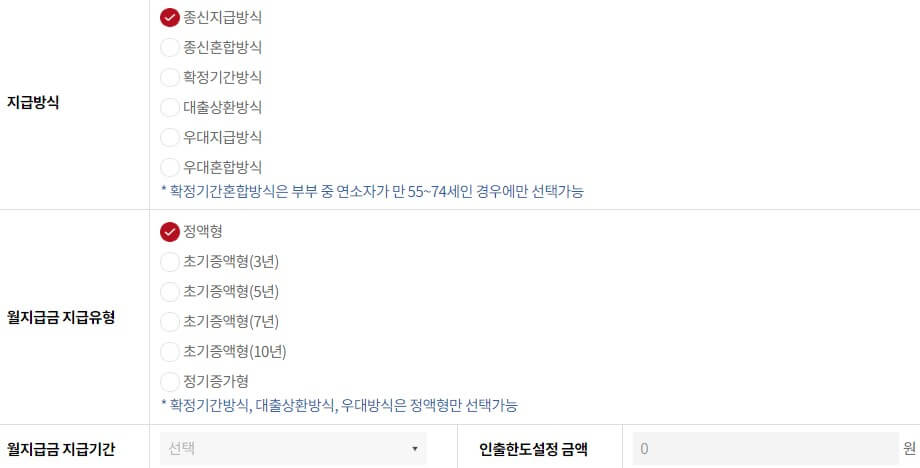 주택연금 수령액을 계산하기 위해서는 주택의 구분과 기준시가, 소유한 자의 생년월일, 지급방식 등을 입력하여 간단하게 예상 수령액을 계산해 볼 수 있습니다.